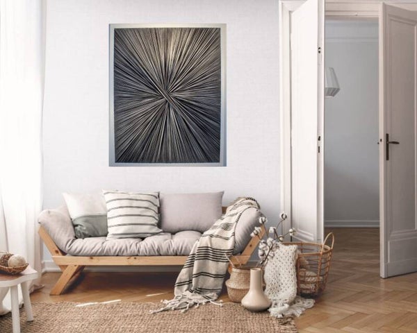 Tissage sur toile, laine noire et blanche, superposition de fils