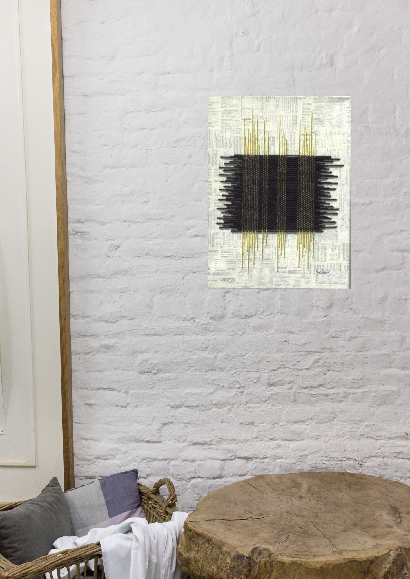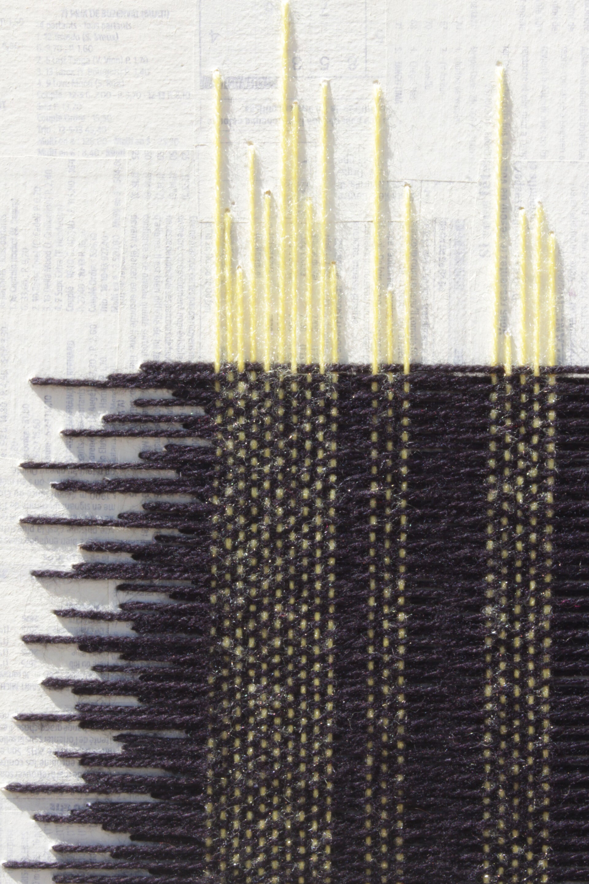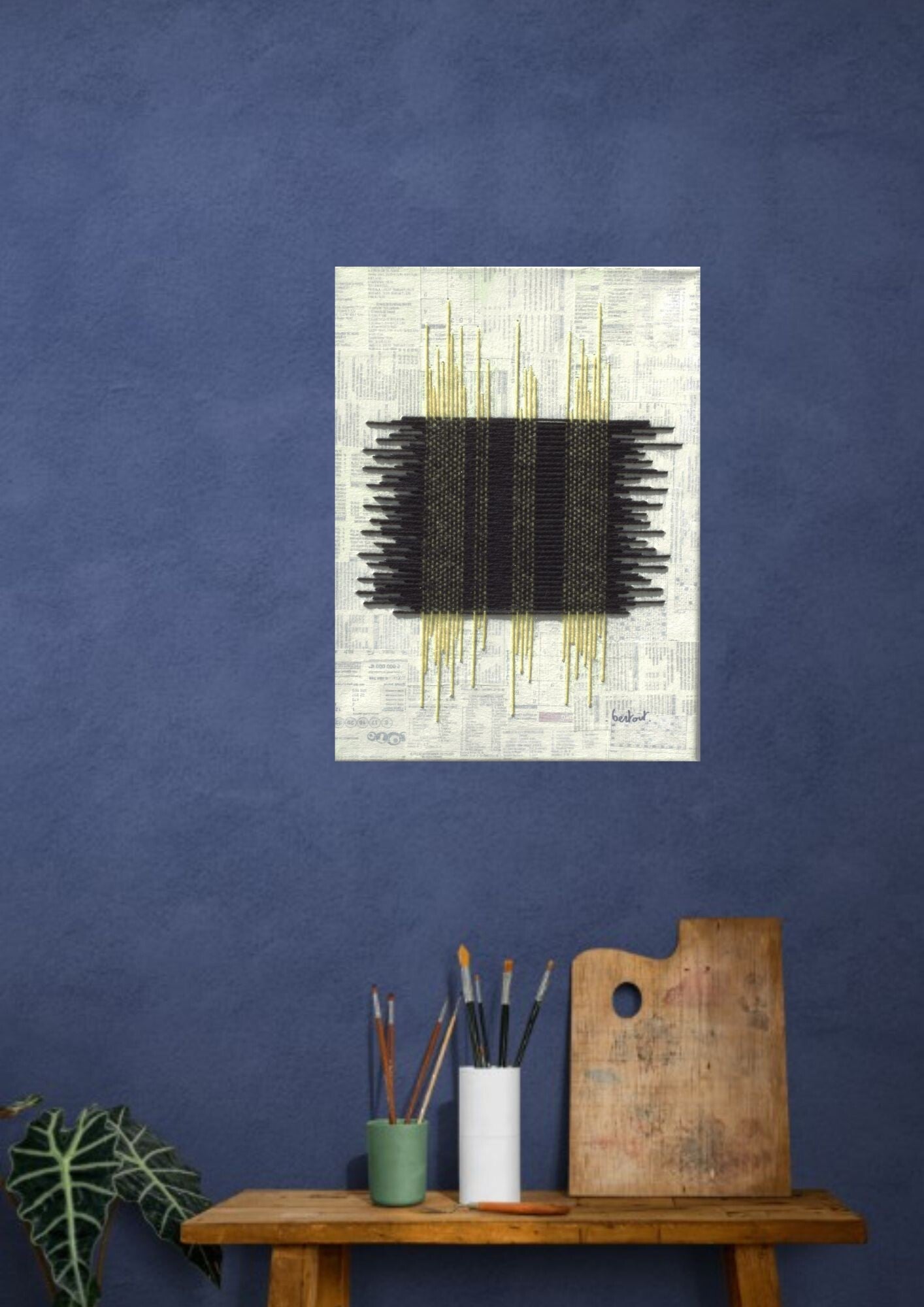 Collage, peinture gouache, toile sans verni, chassis entoilé, tissage croisé à l'aiguille