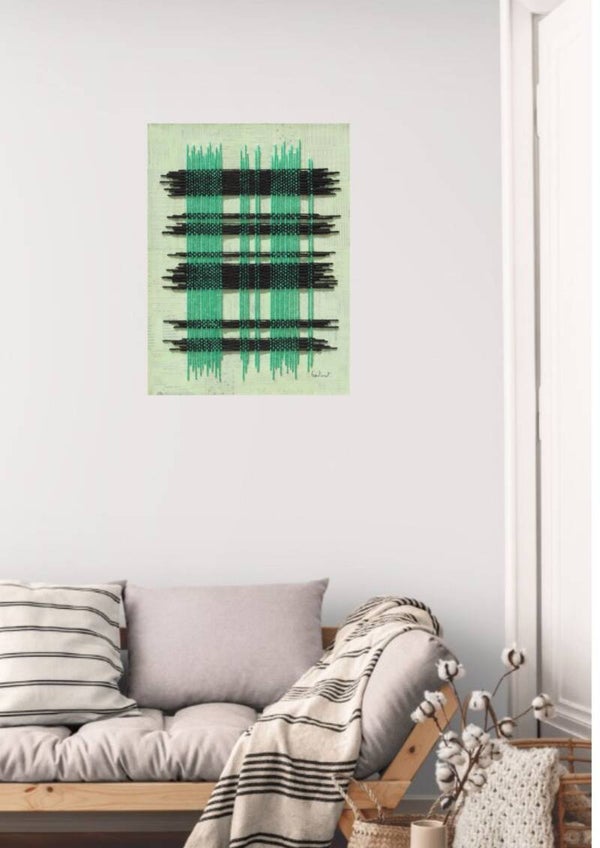 Collage, peinture gouache, toile sans verni, chassis entoilé, tissage croisé à l'aiguille