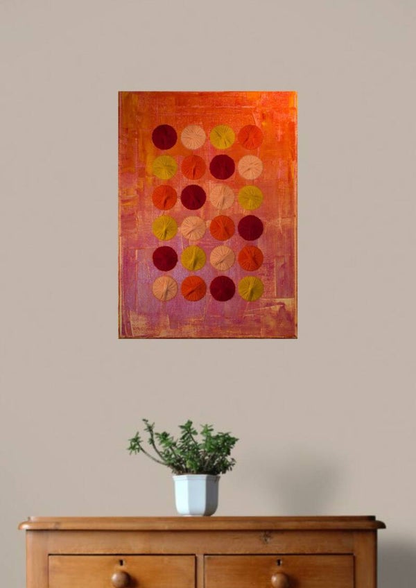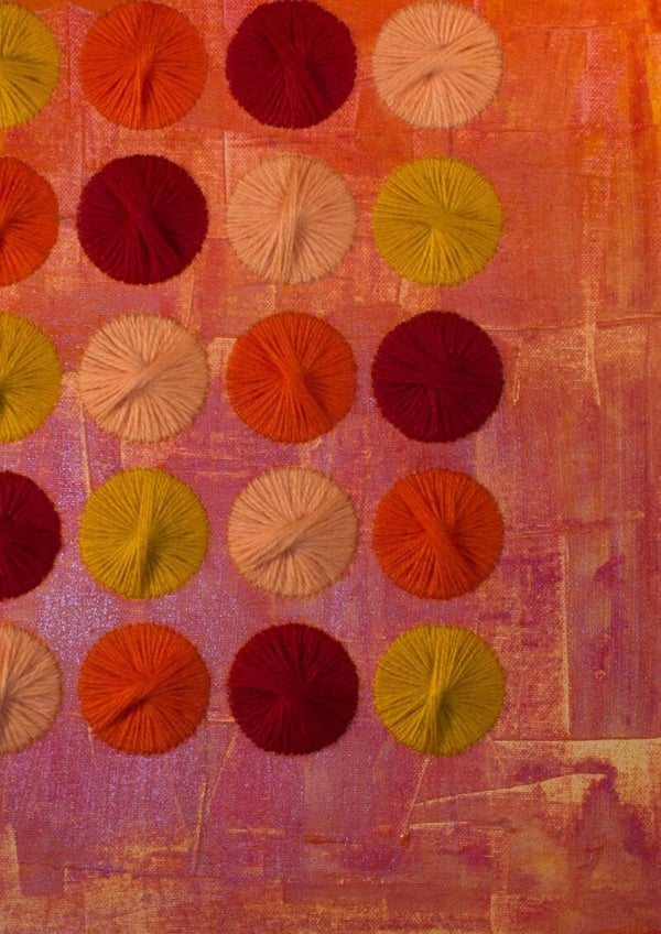 Tissage de laine sur châssis entoilé, peinture gouache, vernis