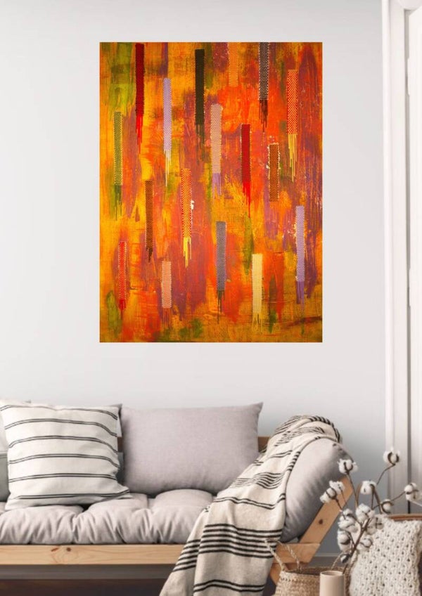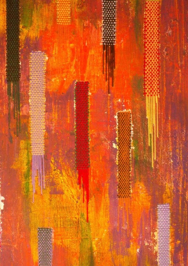 Tissage de laine à l'aiguille sur châssis entoilé, peinture gouache, vernis, travail a la brosse, couteau, spatule
