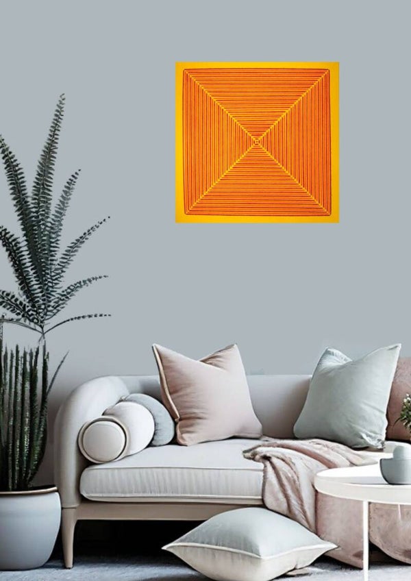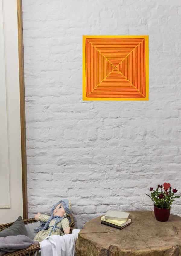 peinture gouache, vernis brillant, tissage de laine à l'aiguille.