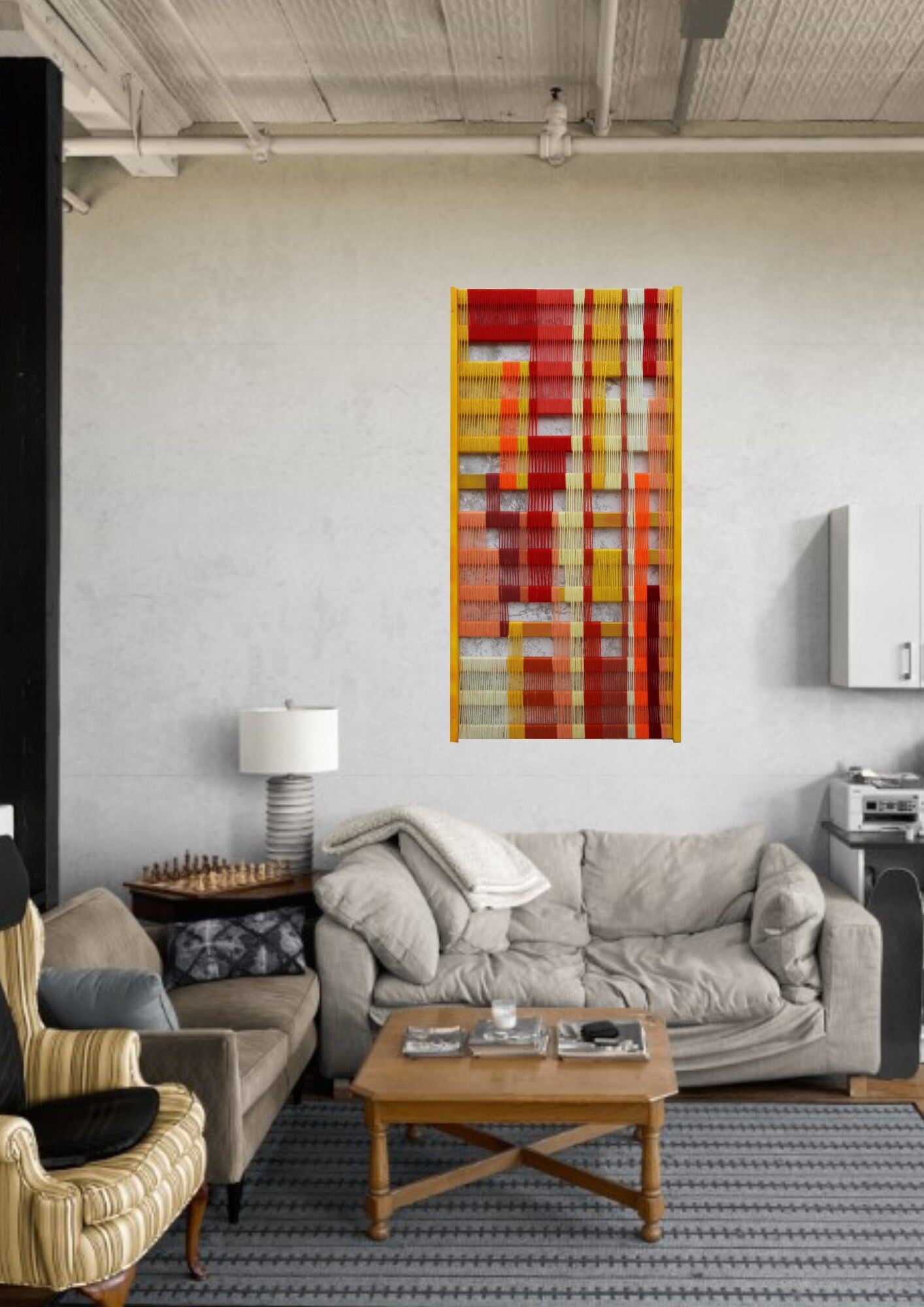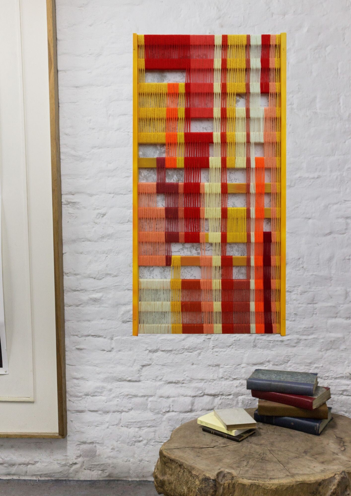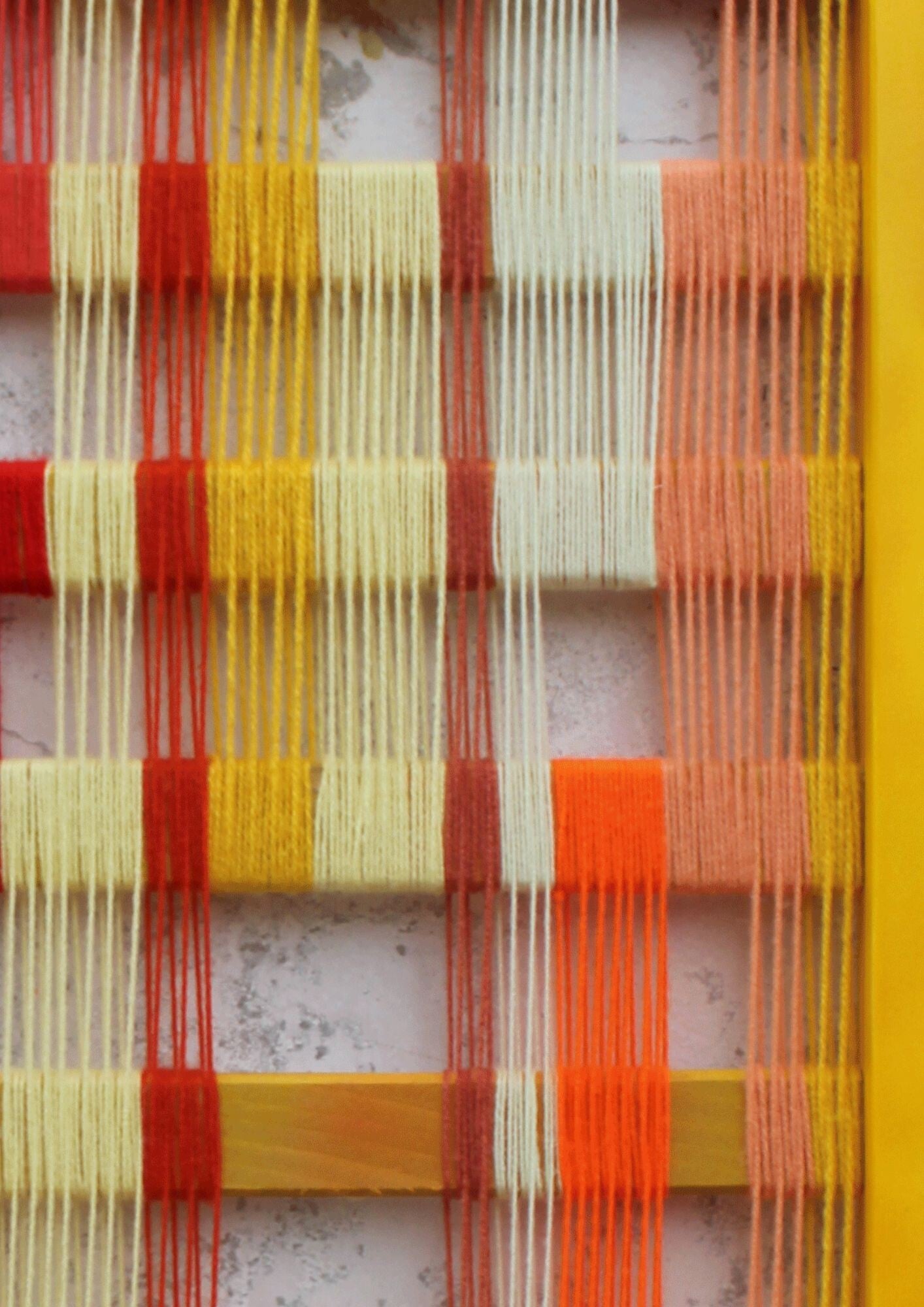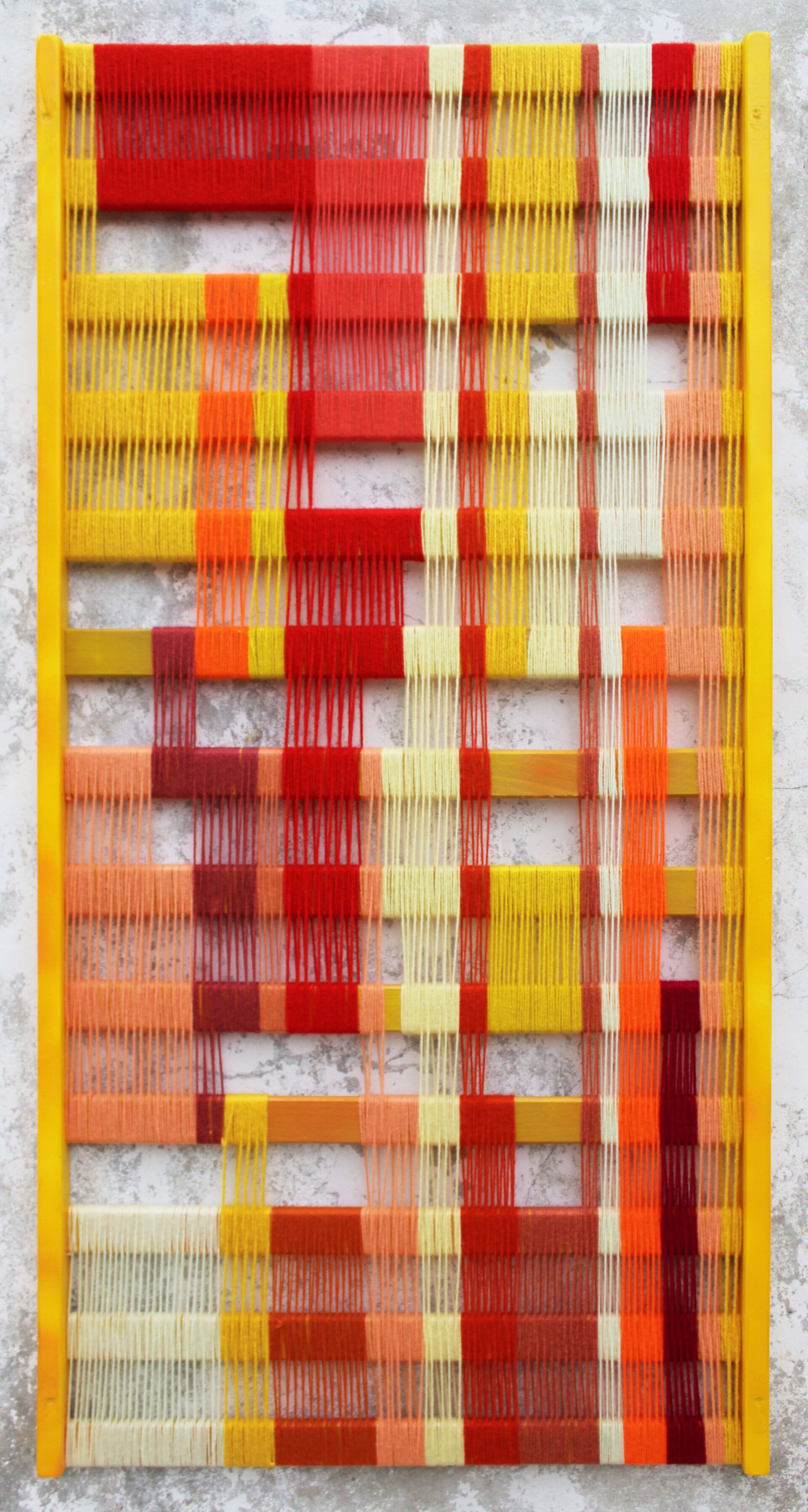 Tissage de laine à l'aiguille sur cadre en bois (Up cycling sommier de lit) peinture gouache, vernis.